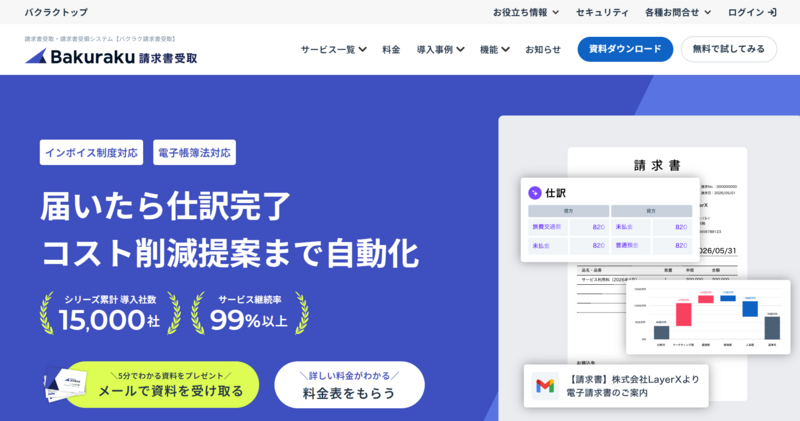 | バクラク請求書受取 | 要問い合わせ | 要問い合わせ | 請求書処理を大幅に自動化したい中堅企業 | 独自OCRエンジンで高精度。電子帳簿保存法・インボイス制度に対応 |