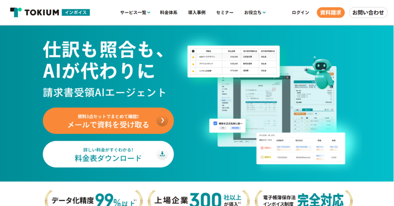 | TOKIUMインボイス | 要問い合わせ | 10,000円〜 | 請求書の受取から承認まで一括管理したい企業 | AI-OCR+オペレーターによる二重チェックで読み取り精度が高い |