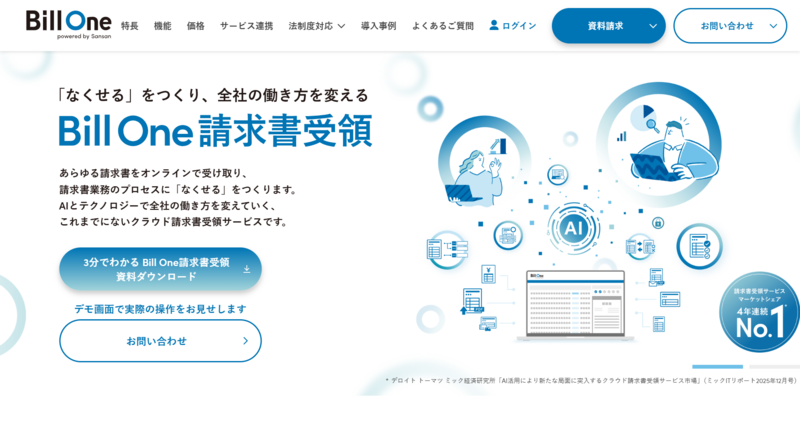 | Bill One | 要問い合わせ | 要問い合わせ | 大量の請求書を効率よく処理したい中堅〜大企業 | 郵送請求書も代理受領・電子化。受取から支払いまで一貫対応 |