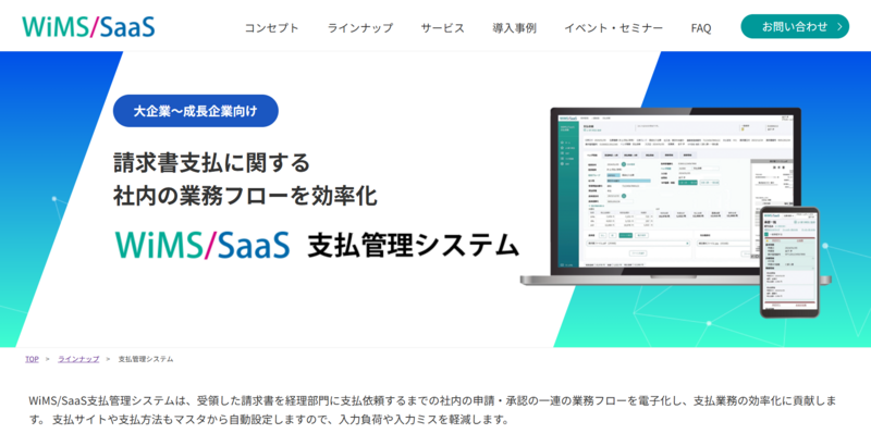 | WiMS/SaaS支払管理システム | 要問い合わせ | 要問い合わせ | 独自の業務フローをシステムに落とし込みたい企業 | 業務設計の柔軟性が高く、企業固有の支払フローに対応しやすい |