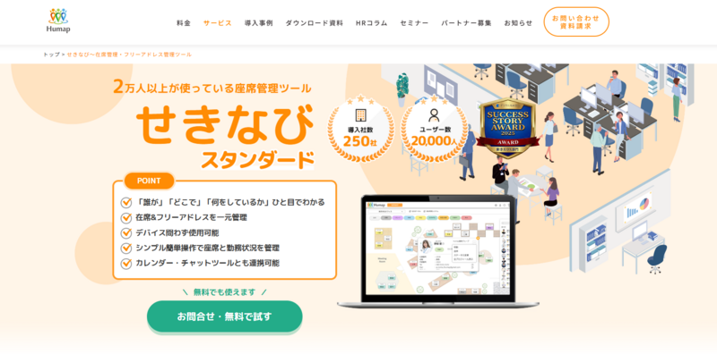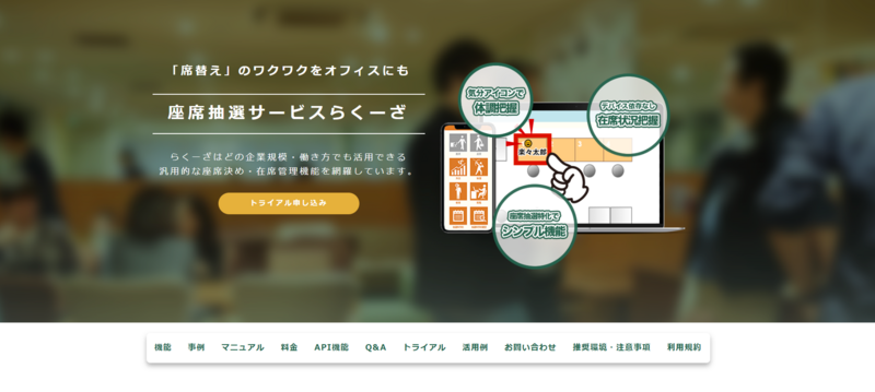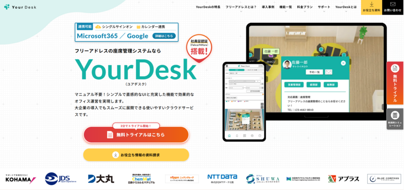 座席管理だけでなく、会議室予約や備品の貸出管理もすることができ、無料トライアルも用意されているため、まずは現場の社員に操作感を試してもらうのがおすすめです。