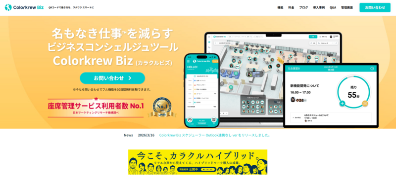 | Colorkrew Biz | 0円 | 120,000円~ | QRチェックイン、備品管理連携 |