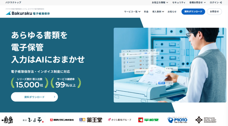 最大100枚の書類を同時アップロードしても、高精度AIが数秒でデータ化。サービス継続率は99%以上で、シリーズ累計15,000社の導入実績があります。無料プランは月200件まで利用可能。バクラクシリーズと組み合わせれば、バックオフィス業務全体を効率化できます。