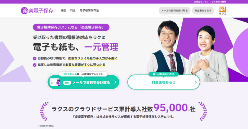 | 楽楽電子保存 | 50,000円 | 17,000円~ | 楽楽シリーズとの連携で経理業務全体を一元管理 |