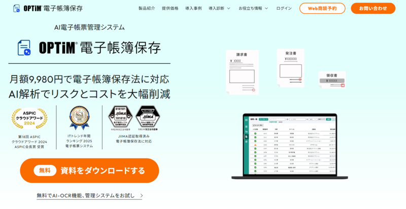 | OPTiM 電子帳簿保存 | 0円 | 9,980円~ | AI自動入力でデータ管理の効率化を実現 |