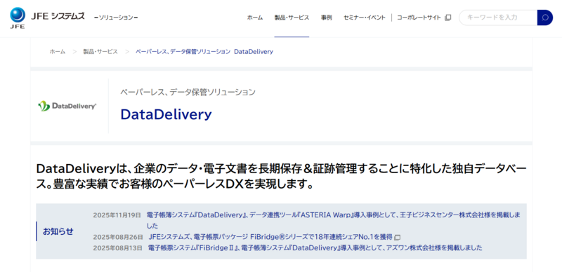 基幹システム(ERP)から出力される膨大な帳票の長期保管に最適で、SAP ERPをはじめとする各種システムとの連携実績が豊富です。4領域のJIIMA認証をワンシステムで取得しており、4,000社以上の企業が電子帳票シリーズとして利用しています。