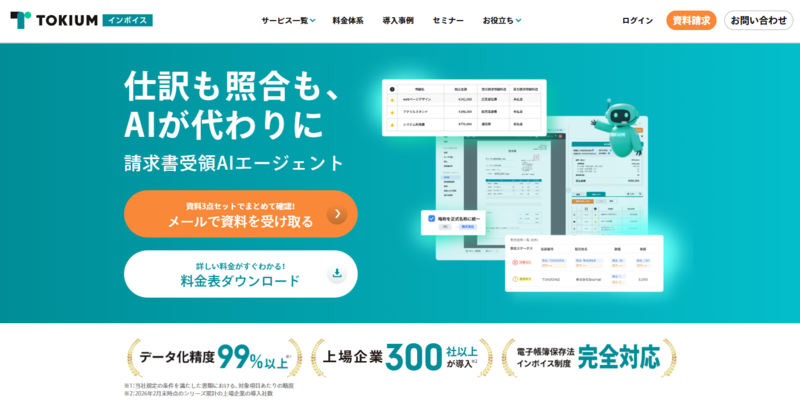 紙・メール・FAXなど、あらゆる形式の請求書の受領を代行し、システム上に自動でデータ化するクラウドサービスです。受領した請求書の原本はTOKIUMが保管するため、社内でのファイリング作業が不要になります。