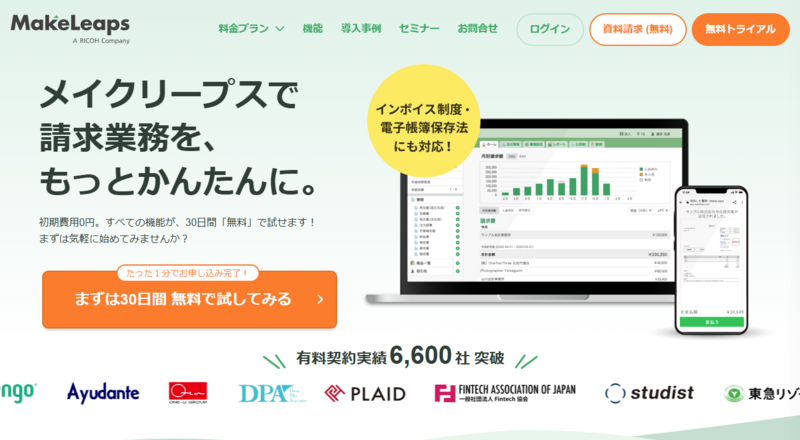 | MakeLeaps | 0円 | 1,000円/1ユーザー~ | 定期請求書の自動作成で入力ミスを防ぐ。中小企業向け |