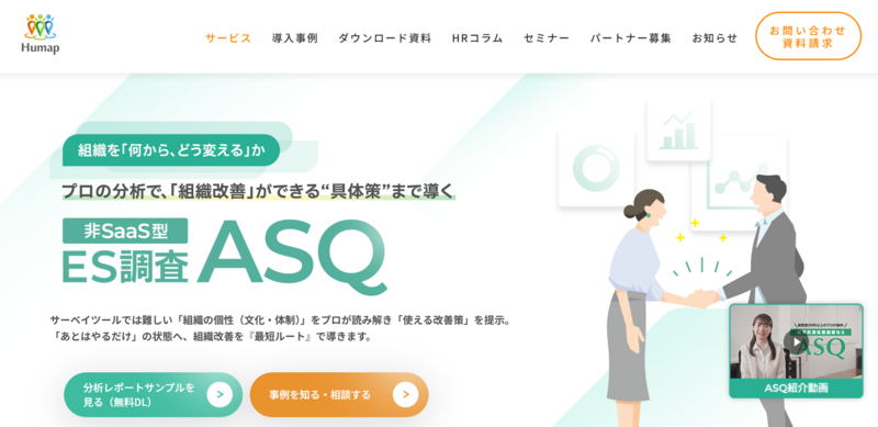 「ツールに入力するだけで終わる診断」ではなく、プロの解釈が欲しい企業に向いています。ASQは調査歴20年以上の専任リサーチャーが結果を深く読み込み、組織の個性(文化・体制)を踏まえた具体的な改善策を提言してくれるサービスです。