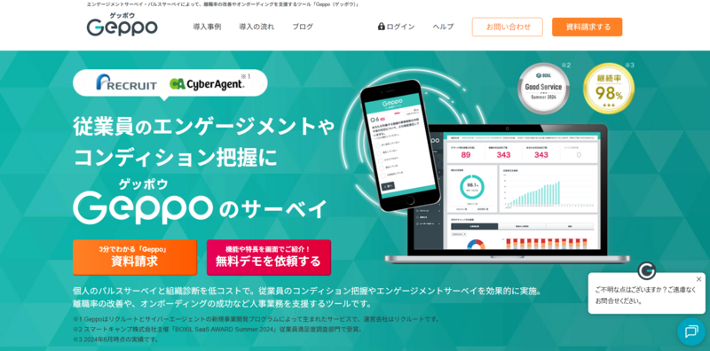 パルスサーベイ機能や離職兆候の検知機能も備えており、コミュニケーション改善とデータ収集を両立できます。スマホアプリ対応で、社用PCを持たない現場スタッフにもリーチ可能です。