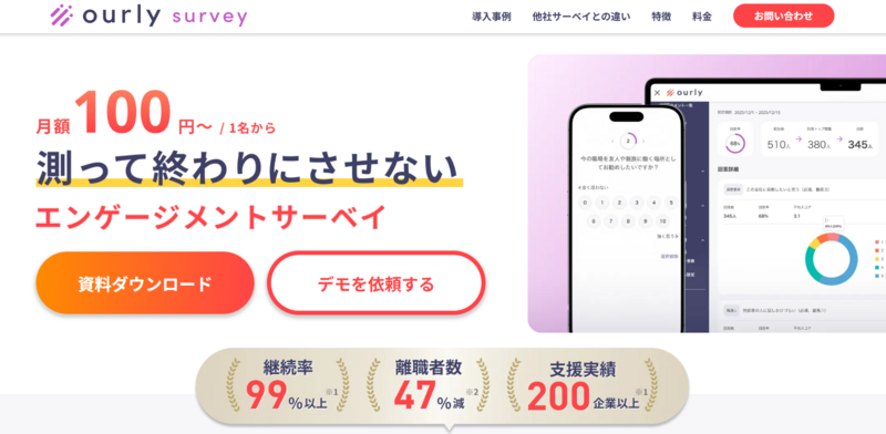 | ourly survey | 要問い合わせ | 100円〜/人 | 測定から改善伴走まで一気通貫。200社以上の支援実績 |