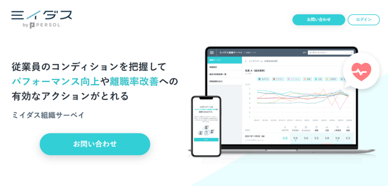 | ミイダス組織サーベイ | 要問い合わせ | 要問い合わせ | 月1回5分。コンピテンシー診断と連動した離職リスク検知 |
