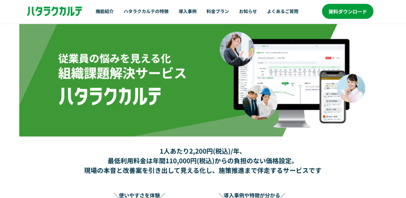 月額150円/人(2,000人契約時)と低コストで、匿名・記名の使い分けや最低1問からの調査設計にも柔軟に対応します。分析結果に連動した施策集が用意されており、改善の方向性を迷わず決められる設計です。