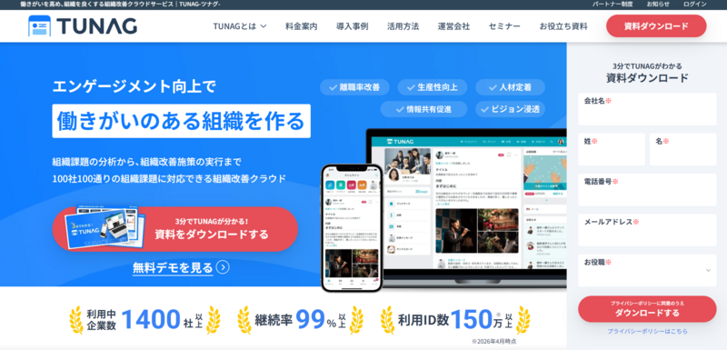 | TUNAG | 要問い合わせ | 要問い合わせ | 1,400社・継続率99%。日常業務での社内コミュニケーション改善 |