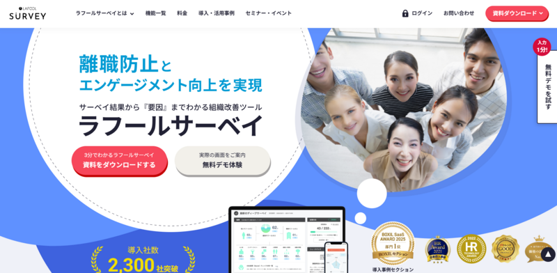 導入社数は2,300社を突破。専任担当者による読み解きサポートや、カウンセリング・研修・1on1代行などの対策オプションも充実しており、「サーベイのやりっぱなし」を構造的に防ぐ仕組みが整っています。