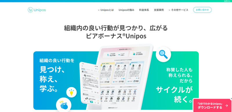 | Unipos | 要問い合わせ | 要問い合わせ | ピアボーナスで感謝・称賛を可視化。心理的安全性と理念浸透を同時に実現 |