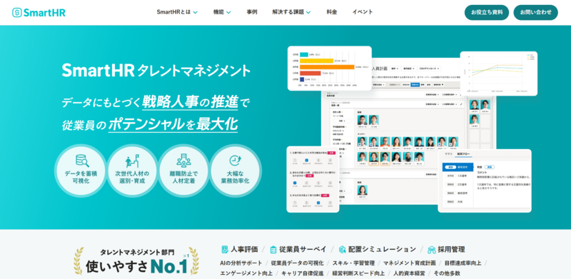 労務管理ツールとして広く知られるSmartHRですが、従業員サーベイ・配置シミュレーション・スキル管理・人事評価・マネジメント育成計画まで備えたタレントマネジメントプラットフォームとしても活用できます。