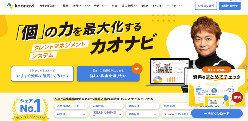 人事評価・サーベイ・人材配置・スキル管理・労務管理・勤怠管理・AI分析まで幅広い機能を備え、利用人数に応じたシンプルな料金体系で導入しやすいのも魅力です。4,500社超のユーザーからなるコミュニティ「カオナビキャンパス」で、他社の人事担当者と課題や知見を共有できる点もユニークです。