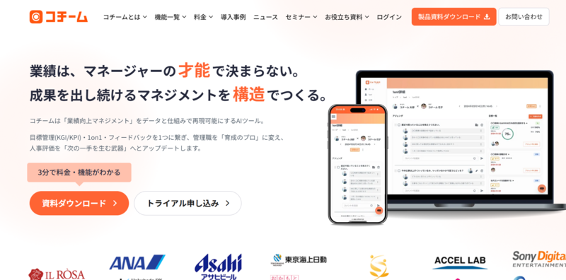 | Co:TEAM(コチーム) | 要問い合わせ | 要問い合わせ | 1on1×OKR×AIで業績向上を数値化。200社以上が導入 |
