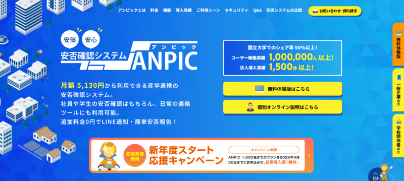 | ANPIC | 25,000円~ | 年額:61,560円〜 | 100万ユーザー超、LINE追加費用なし、大学40%シェア |