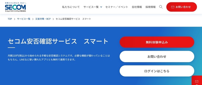 | セコム安否確認サービス スマート | 0円 | 220円(税込)/ID~ | 300名以下向け、LINE連携無料、8言語対応 |