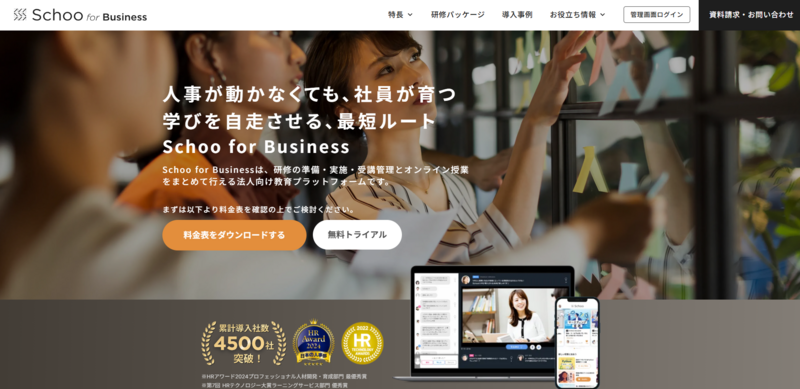 株式会社Schooが提供する法人向けeラーニングサービスで4,500社超の導入実績があります。ライブ授業とオンデマンド視聴の両方に対応しており、ビジネス・ITスキル・マネジメントなど幅広いジャンルのコースを提供しています。受講管理・進捗確認などのLMS機能も備えており、コンテンツを自社で制作しなくても研修体制を構築できます。DXスキル診断など、自律学習を支援する機能も搭載されています。