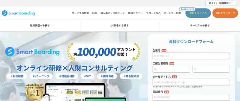 | Smart Boarding | 100,000円 | 1,080円/ID〜※最低30ID | 約1,200社導入・豊富な種類のコース搭載 |