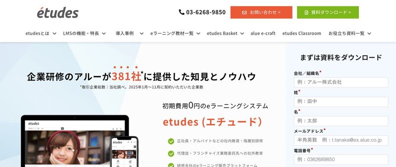 アルー株式会社が提供するLMSです。初期費用0円・最短1ヶ月からの契約で始めやすく、自社教材のみのシステム利用型からアルー教材の定額受け放題プランまで3つの構成から選べます。