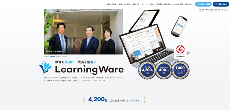 ユーザ数が増えても月額料金が変わらない定額制を採用しており、組織拡大時もコストを一定に保てます。高いセキュリティ基準と直感的な操作性を備えており、管理者・受講者双方が使いやすい設計です。