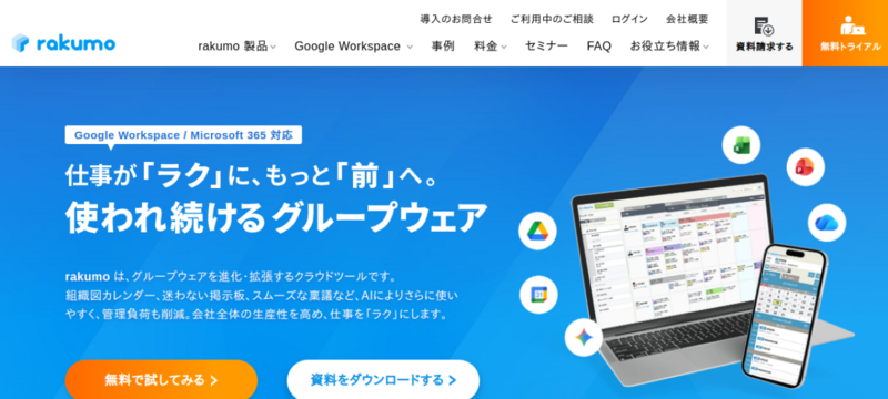 | rakumo | 要問い合わせ | 680円/ID〜 | Google Workspaceの機能を補完する6つの業務ツール群 |
