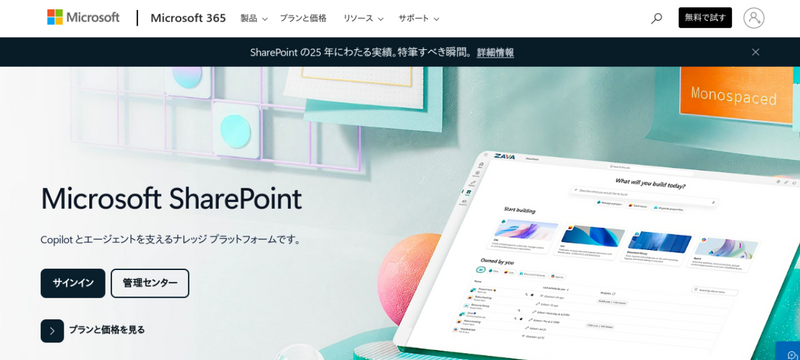 | SharePoint | 0円 | 899円/ID〜 | Microsoft 365環境のイントラネットと文書管理の中核 |