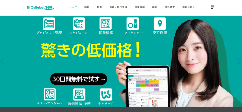 | NI Collabo 360 | 0円 | 360円/ID~ | 中小企業向けに機能を絞ったシンプルな国産グループウェア |