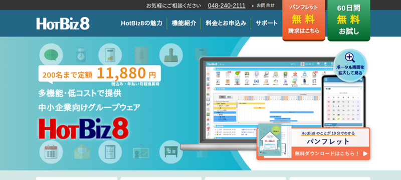 株式会社ASJが提供するHotBiz8は、クラウド型の中小企業向けグループウェアです。スケジュール管理・掲示板・ファイル共有・ワークフローなど多彩な機能を搭載しており、スマートフォンからもアクセスできます。200名以内の定額制のため、その範囲内でユーザーが増えても月額料金が変わらず、コストの見通しが立てやすいです。60日間の無料トライアルが用意されており、現場の使用感を確認してから本導入を判断できます。