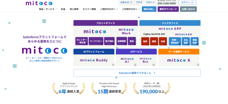 | mitoco | 0円 | 800円/ID~ | Salesforce基盤上で動くグループウェア。CRMと業務管理の統合が強み |