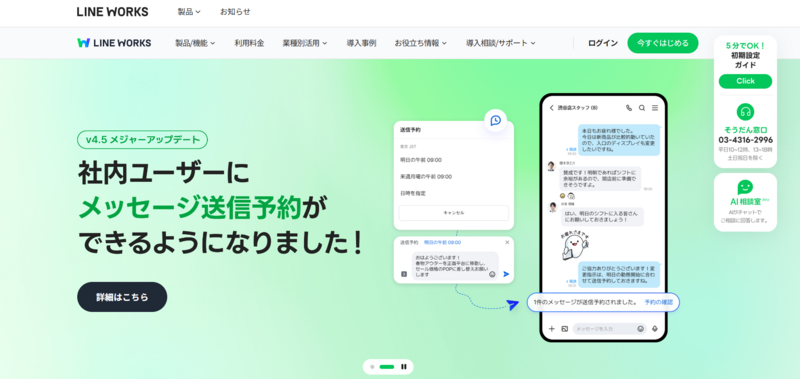 | LINE WORKS | 0円 | 450円/ID〜 | LINEと繋がれる唯一のビジネスチャット。30人まで無料で使えるフリープランあり |