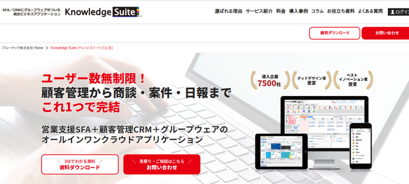 ブルーテック株式会社が提供するKnowledge Suiteは、グループウェア・名刺管理・CRM・SFAを一つのプラットフォームに統合したサービスです。ユーザー数無制限の定額料金制を採用しており、社員が増えても月額料金が変わりません。スケジュール管理・掲示板・ワークフローなどのグループウェア機能に加え、営業管理のCRM・SFA機能も利用でき、部門横断で一つのシステムに統一したい企業に向いています。