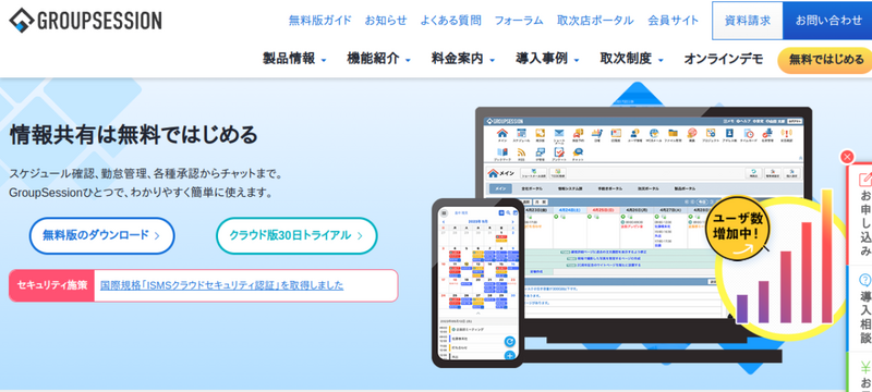 | GroupSession | 0円 | 300円/ID~(税別) | 無料版からクラウド・エンタープライズまで段階的に拡張できる国産グループウェア |