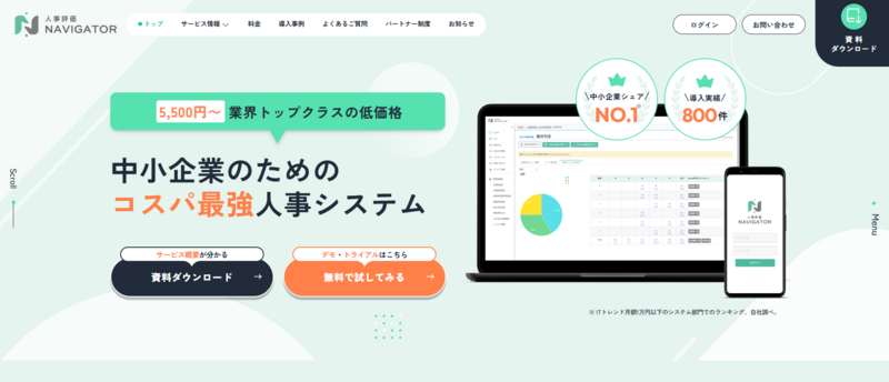 中小企業向けに特化した人事評価システムです。人事コンサルティング会社(株式会社日本経営)が開発した知見をもとに設計されており、フィードバック面談・行動観察のメモ記録、一次評価の一括コピー、経営者向け報告書の自動生成など、評価業務の効率化を幅広く支援します。