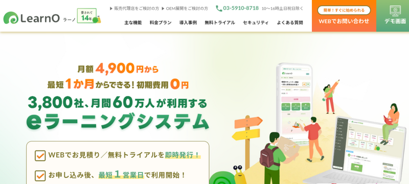 人事制度にリスキリング支援を組み込む際に活用できるeラーニングシステムです。オリジナルのeラーニングコンテンツを作成・配信でき、社員の学習状況を一元管理できます。初期費用0円・月額4,900円〜の料金体系で、最短1営業日での利用開始が可能です。