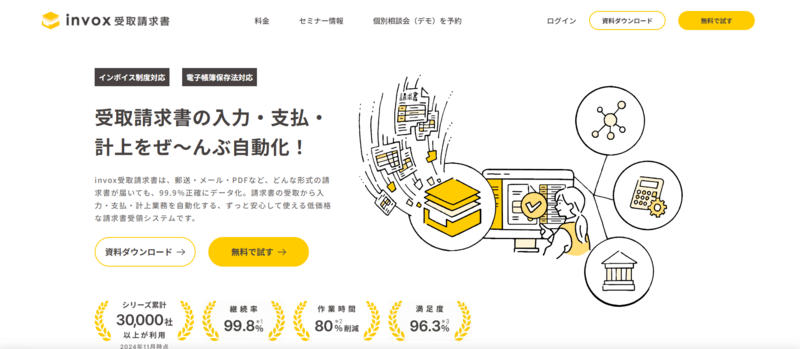 | invox受取請求書 | 0円 | 980円〜+データ処理料金 | 99.9%以上の精度でデータ化。シリーズ累計30,000社以上導入実績 |