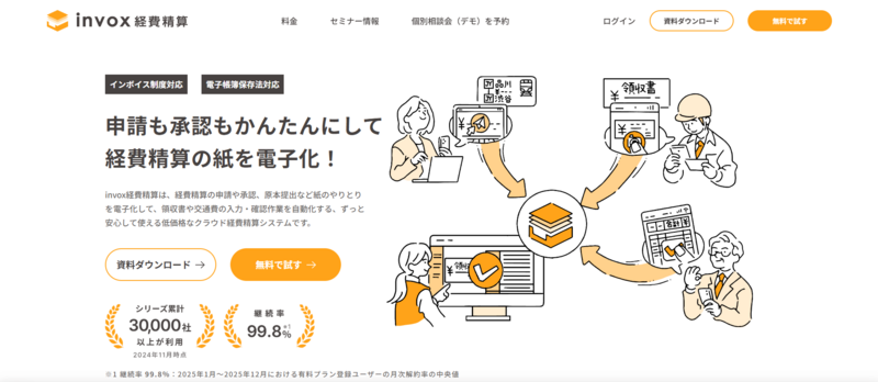 領収書の手入力や紙での承認回覧に時間を取られている経理部門に向いています。スマートフォンで撮影した領収書をAI-OCRで自動データ化でき、経路検索機能やモバイルSuica連携による交通費精算にも対応しています。申請・承認ワークフローを電子化でき、仕訳データを自動生成して会計ソフトへ連携できます(ワークフロー・仕訳生成はベーシックプラン以上)。電子帳簿保存法・インボイス制度にも対応しています。
