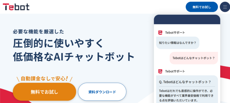 | Tebot | 0円 | 9,800円〜 | AIチャットボット・社内問い合わせ対応 |