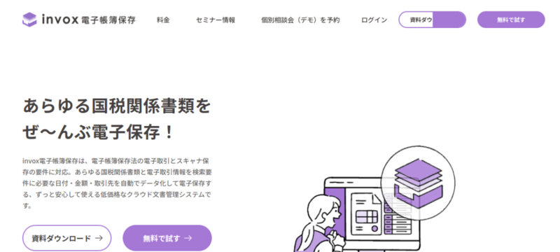 | invox電子帳簿保存 | 0円 | 1,980円〜+データ化料金 | 電帳法の検索要件を自動で満たしてクラウド保存 |
