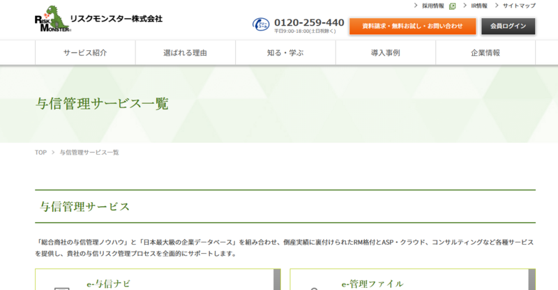 | 与信管理サービス(リスクモンスター) | 要問い合わせ | 要問い合わせ | 企業データベースに基づくRM格付で与信判断を標準化 |