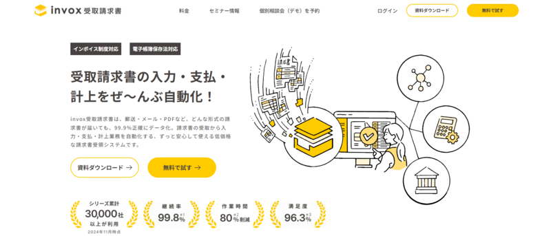 紙・PDFの請求書をAI OCRで自動読み取りし、会計システムへの仕訳データを自動生成するツールです。手入力を大きく減らせるため、請求書処理にかかる工数を削減できます。インボイス制度・電子帳簿保存法への対応も自動化できるため、法改正対応コストも抑えられます。