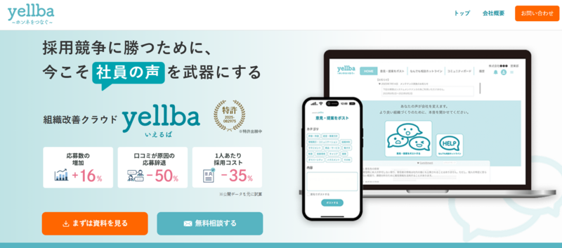 株式会社yellbaが提供する、社員の本音を匿名で集めて組織課題の発見と改善アクションにつなげる組織改善クラウドです。トップダウンの施策ではなく、現場からの声をもとに改善を進めたい会社に向いています。