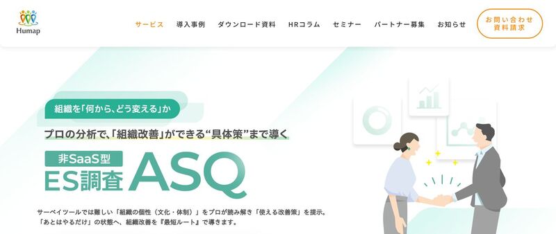 株式会社アスマークが提供する、従業員満足度調査・エンゲージメント調査・施策提言を一体で受けられる組織診断サービスです。調査会社としての知見を活かし、調査設計から集計・分析・改善策の提示までを支援します。
