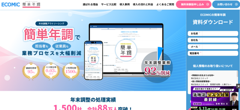 年末調整の時期だけ労務担当者が忙殺される企業に向くのが、年末調整をまるごと外注できる「簡単年調」です。株式会社エコミックが提供しており、従業員が保険料控除証明書などを写真撮影してアップロードするだけでデータ入力を代行してくれます。