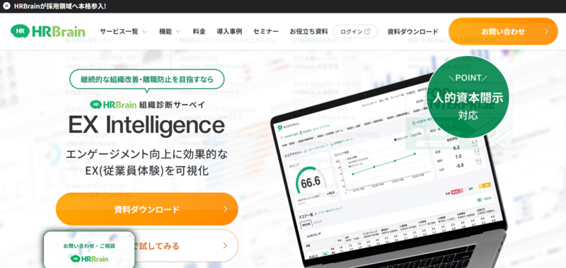 株式会社HRBrainが提供する組織診断サーベイです。従業員エクスペリエンス(EX)をベースにした設問設計で、社員の期待と実感のギャップを可視化し、エンゲージメントの阻害要因を特定します。