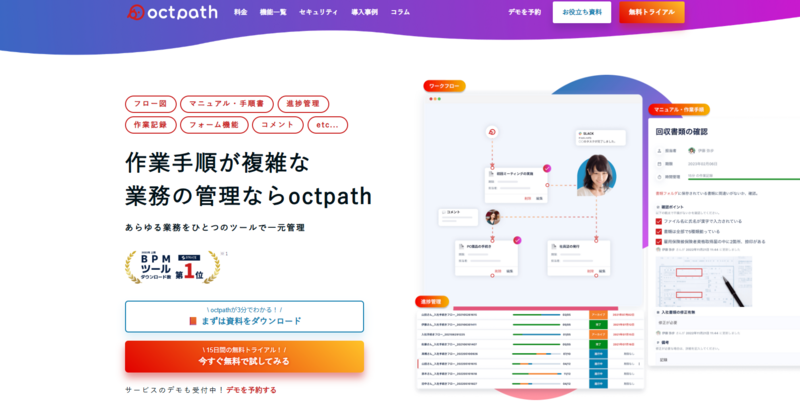 業務の属人化・ミス・抜け漏れに悩む管理部門に向いています。フロー図・マニュアル・進捗管理・作業記録をひとつのツールで一元管理できるプロセスマネジメントサービスです。作業手順を順番に表示し、担当者は流れに沿って進めるだけでよいため、経験や知識に依存しない安定した業務品質を実現できます。入社・退社対応、請求管理、備品発注など、管理部門で発生する定型的な業務フローの標準化に適しています。